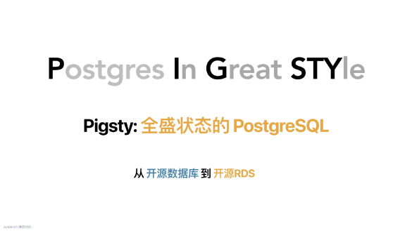 这就是我们正在做的事情,Pigsty。Pigsty 是 Postgres in Great STYle 的缩写,即“全盛状态下的 PostgreSQL”。 它完全开源,是一个基于开源软件的,可以跑在任何地方的,浓缩了 PostgreSQL使用最佳实践的,Me-Better 开源 RDS 替代。
