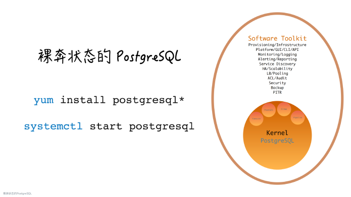 一个生产级、企业级的数据库服务,内核只是其中一部分,更重要的往往是配套的软件与服务。基础设施管理平台、监控日志、告警规则、服务发现、高可用,连接池、负载均衡、访问控制、审计、安全备份、PITR。只有把这些整合起来,才能变成一个企业级的数据库服务。