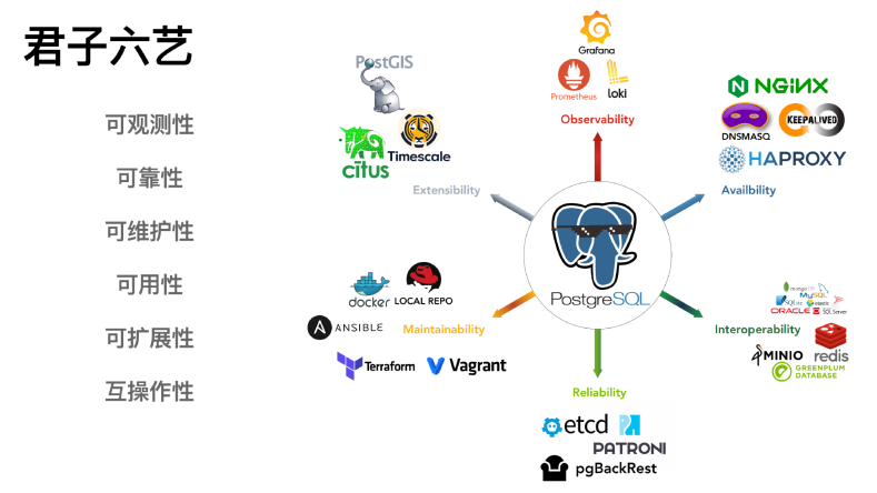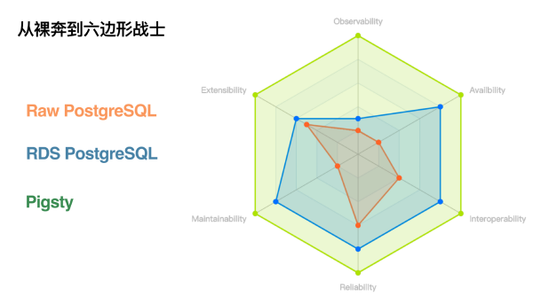 Pigsty 就是这样的一款产品,它在六个重要的维度上,做了很多的工作:可观测性、可靠性、可维护性、可用性、可扩展性以及互操作性。