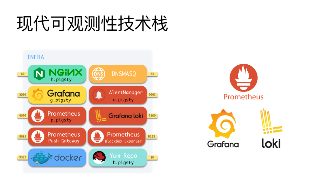 Pigsty 就带有这样一套可观测性的基础设施,包括 Prometheus 全家桶、时序数据库、 Prometheus 推送组件 PushGateway、AlertManager用于告警、黑箱监控 Blackbox Exporter,等等。