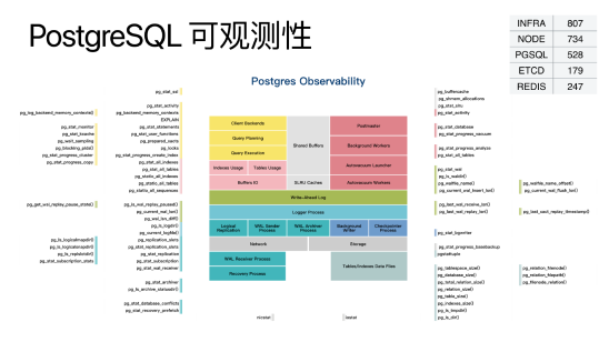 实际上我们有一些用户并不是奔着 PostgreSQL数据库发行版来的,而是奔着这一套开箱性的可观测性组件来的。这里我们把 PostgreSQL的可观测性点全部都列了出来, PG 本身提供了很多的可观测性点,而我们自己编写的 PG Exporter 把这些监控指标全部采集过来。