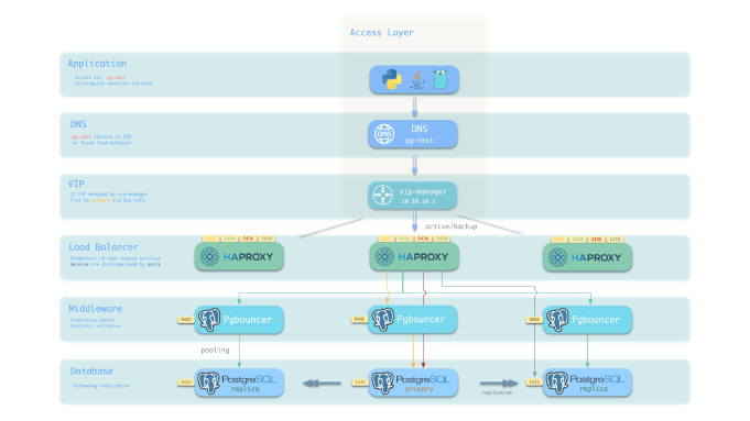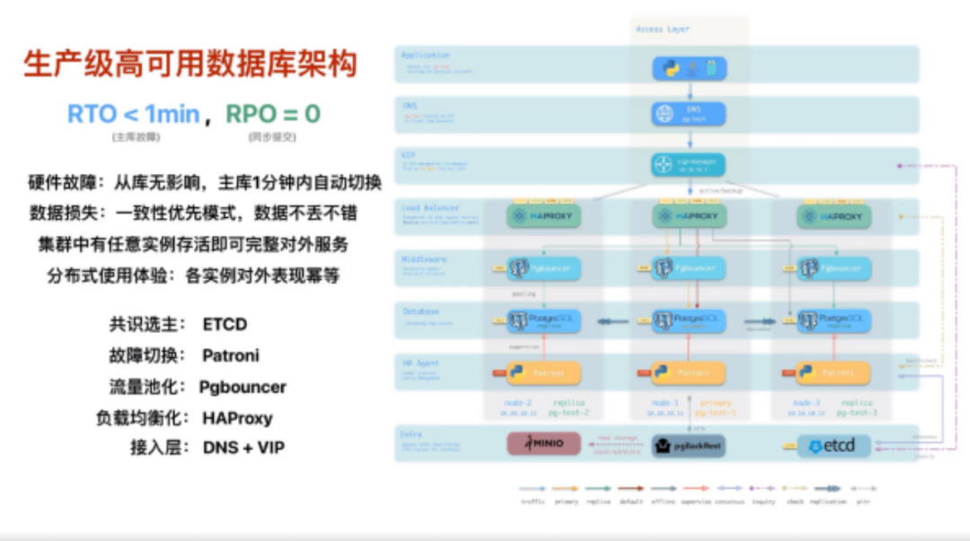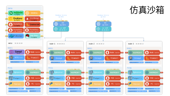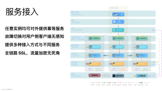 有一些数据库厂商的高可用,数据库自己故障切换完,是不管客户端的,还要求应用自己去修改DNS,修改VIP,然后重启生效。这是一个痛点,所以Pigsty送佛送到西,将客户端接入部分:负载均衡、连接池这些,一并做成开箱即用的架构解决方案。