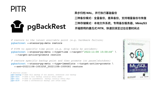 Pigsty为创建的数据库都默认启用了WAL归档,每天一本地备份。使用集中存储仓库 (MinIO/S3)的时候,可以保留更多(默认两周)的全量备份,也就是,用户一键可以回溯到过去两周的任意时间点,而且这个操作还可以高效地、并行地,增量地重复地进行。一键傻瓜式的完成,用户再也不用担心程序员删库跑路了。