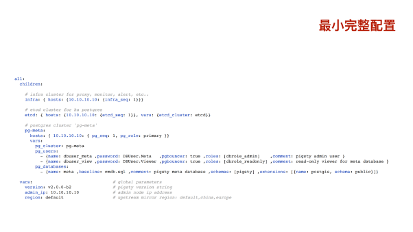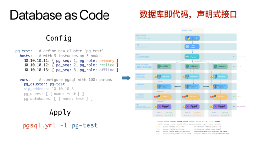 在这一点上, Pigsty 中我们提供了一套类似于 Kubernetes 的声明式API,并且使用 ansible playbook 来实现了一个幂等的控制器逻辑。