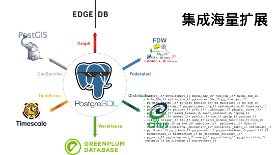 可扩展性是如何为现有系统加装功能的能力。这里面我们深度集成了 PostgreSQL 的三大核心扩展PostGIS、TimescaleDB、Citus ,与无数PG生态的插件。