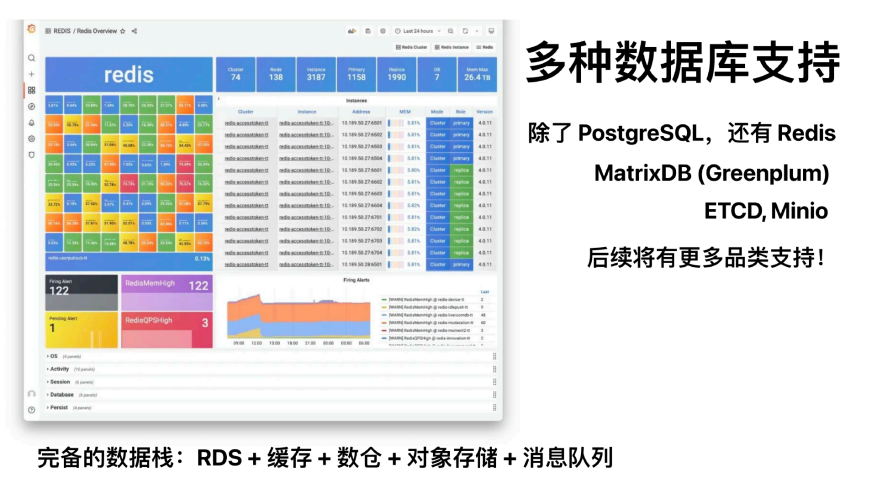 除此之外,用户在使用 PG之时,也常常会用到Redis,所以Pigsty也支持高可用 Redis 集群的部署与监控,此外还有 MatrixDB (Greenplum7) 的监控支持,后续我们还会把Kafka、 MySQL 这样几个给做进来。