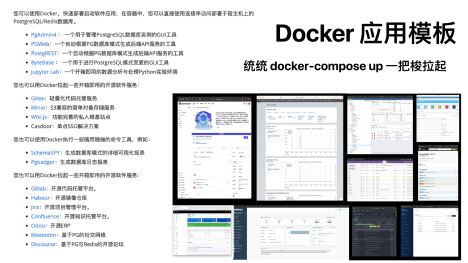 您可以直接通过Docker模板来为PostgreSQL 加装这些能力,让 PG真正成为一个全能的超融合数据库,这是 PG 的可扩展性。