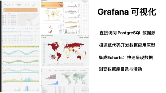 Pigsty除了用来做监控系统和数据库管控软件,也被用户挖掘出了一些其他用途,比如开发低代码应用和数据可视化。Pigsty里面带了一个Grafana,ECharts面板可以直接用来制作交互式的可视化应用。又可以直接访问 PG 查数据,可以用简单拖拽组件的方式去开发一个原型数据应用。