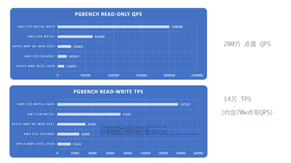 我自己在 96 核的机器上用 PGBENCH 压测,点查的 QPS 吞吐上限在 200 万请求/秒 附近。而单条写入的吞吐量差不多在 70 万左右的。