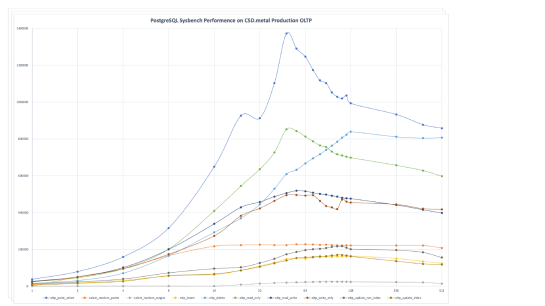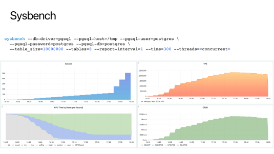 除了PGBENCH 还有一些更通用的测试工具,例如 SYSBENCH。这里我们用它的 point select 场景可以测到 230 万 point select 每秒的量级。下面就是在 AWS 的 C5D Metal 机型上测出来的吞吐-并发曲线。