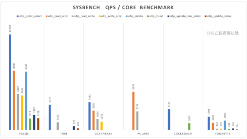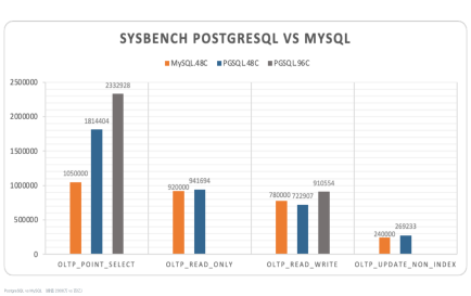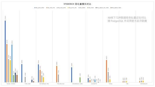 如果我们把其他的一些数据库官网的SYSBENCH结果拉过来放在一起对比,可以发现更有趣的结果,这张图基本里,大家基本都是四十八核左右的测试结果,PostgreSQL 的性能是相当爆炸,冠绝群雄。