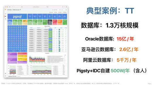 如果用 AWS 或是阿里云肯定比 Oracle 便宜,但也要几千万、两三亿。而在 IDC托管代维物理机的基础上,用 Pigsty自建数据库,整个 PostgreSQL 的成本开销含人也就只要500 万, 对一个 13000 核规模的数据库集群来说,可谓是相当便宜了。