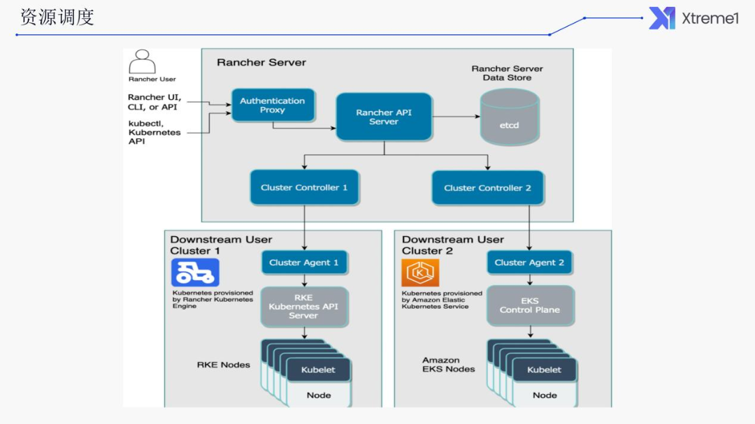 下图为架构图。Rancher 本身也是要部署在 K8S 集群里面的,本身也是一个分布式的系统,通过它可以管理多个Cluster。这里 Cluster 1 和 Cluster 2 同时会接入到 Rancher 里面。Rancher 本身也提供了UI,可以去管理它。