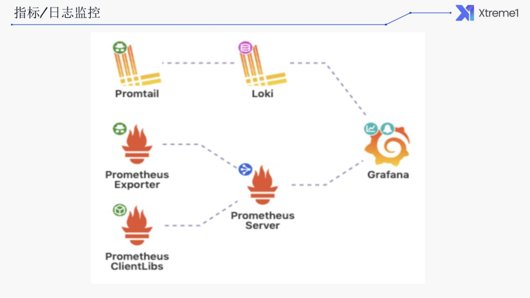 另外希望系统尽量轻量级,不想去采用这种传统的ELK 的一些比较重量级的方案。所以我们选择了 Prometheus + Loki + Grafana 的一套组合。Prometheus 基本上已经是云原生监控的一个标准了,它可以用来当作存储和提供查询的指标。Grafana 用来进行展示,可以将 Prometheus 中的一些数据查询出来做可视化展示。
