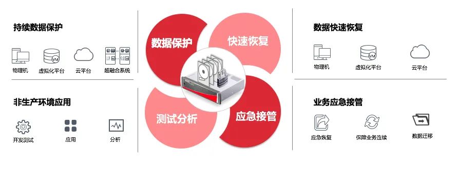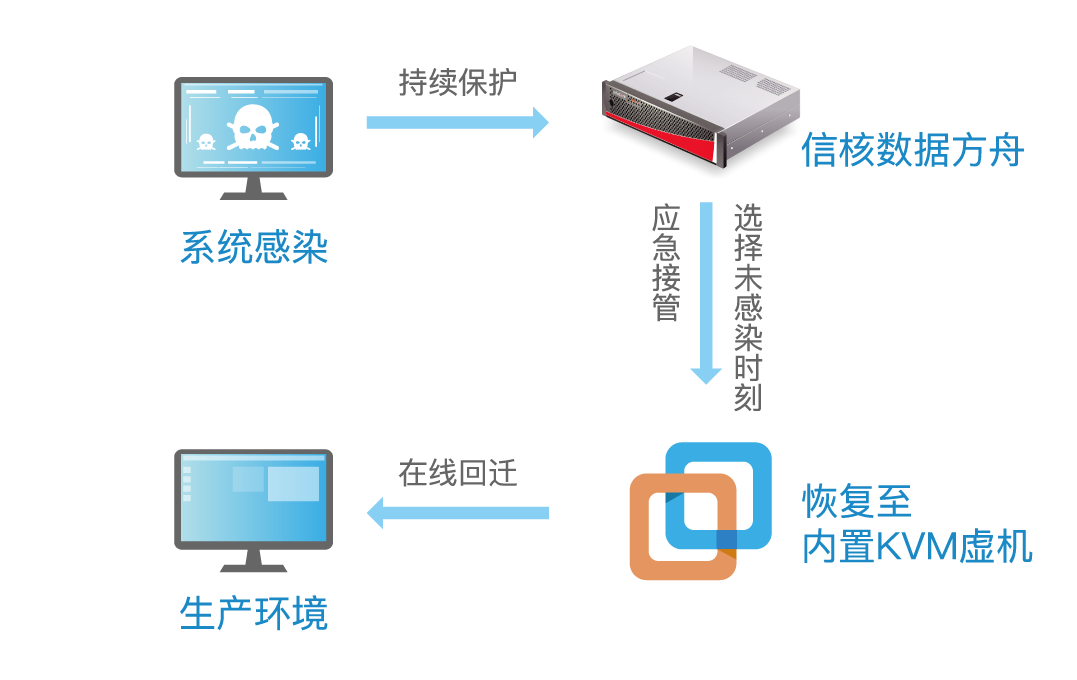 若系统被病毒锁死,可通过数据方舟的应急接管功能快速将业务恢复至被锁前状态,在原有业务环境修复或者新业务环境搭建完成后,通过在线回迁功能,将业务交割至生产环境,保障RTO无限贴近最小值。
