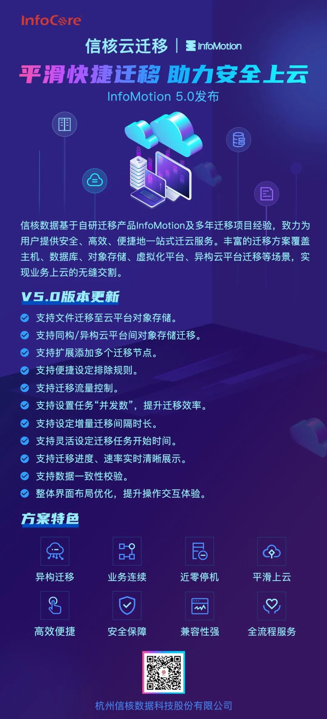 信核InfoMotion5.0可提供“文件迁移”、“对象存储迁移”服务,帮助用户将文件系统中的数据或云服务商对象存储中的数据,迁移至公有云/私有云的目标对象存储中,极大降低迁移操作的复杂性,提高迁移效率,全程在线进行,无需中断业务,实现业务上云的无缝交割。