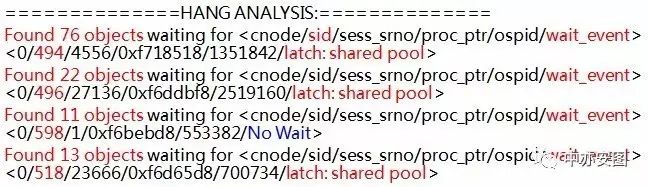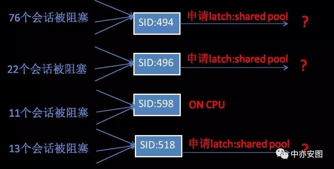 1)共76个会话被sid=494的会话阻塞,原因是sid=494的会话本身申请latch: shared pool资源时被其他会话阻塞。