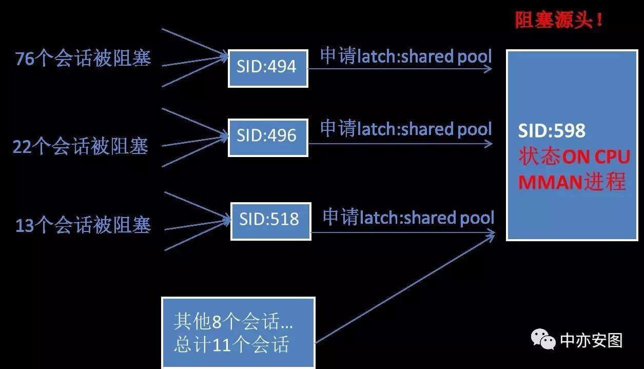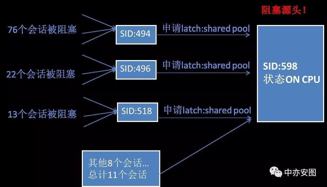 4)共13个会话被sid=518的会话阻塞,原因是sid=518的会话本身申请latch: shared pool资源时被其他会话阻塞。