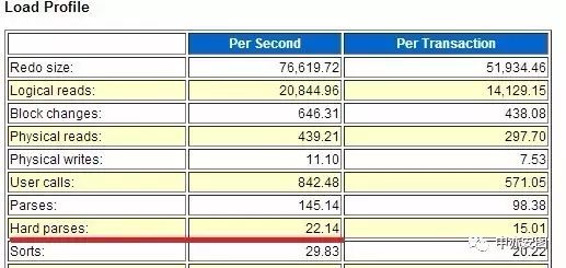 可以看到,每秒硬解析达到了22次!说明SQL语句的共享性做的不好。
