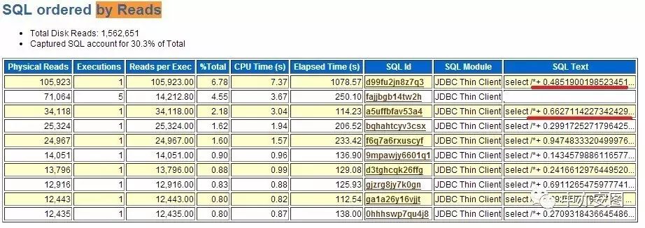 说可以,是因为,可以看到,该系统物理读高的SQL有不少,并且很多SQL单次执行时间超过100秒!如果SQL语句优化后,buffercache就几乎不需要动态调大了,同时SQL优化后执行时间短了,需要pin的时间也短了,几个因素变好了,问题遇到的概率就小很多很多。