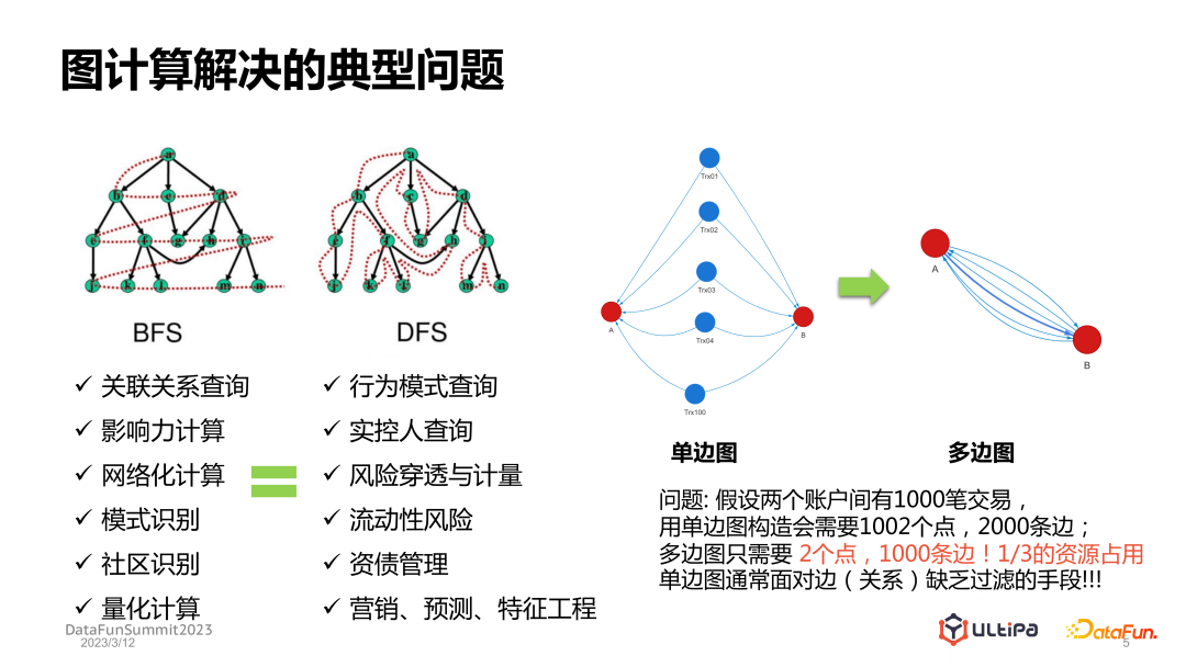 例如:要为两个账户以及他们之间的一千笔转账交易关系构图。就存在两种解决方案。一种是将账户与转账都设计为节点,构建成一个包含 1002 个节点、2000 条边的异构单边图。而另一种则是构建成一个包含 2 个节点和 1000 条边的同构多边图。其中,单边图往往在边的过滤能力上存在局限,且计算复杂度也会更高。