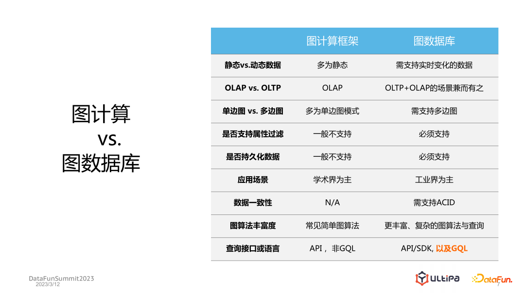 在实际的图计算应用场景中,往往同时会出现图计算框架与图数据库两种技术架构。在这里我们也需要对这两个概念加以区分。