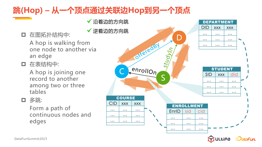 在图论中,沿着一条边游走一个单位路径被称之为一跳(hop)。在对图中的顶点进行遍历时,就会涉及到多跳的问题。在图论中一段游走的路径就是多步跳(跃)的过程。如果用关系型数据库的语言来组织的话,这则是一个多重表连接 Join 的过程。