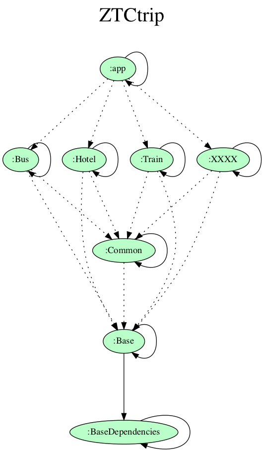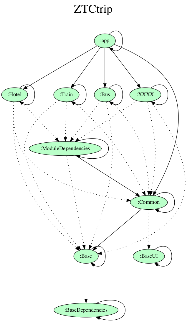 //ext扩展(接口为ExtraPropertiesExtension.java)中定义统一方法def compileBundle(Project project, String depName = null) {def projectName = depName ?: project.namedef dependenciesHandler = project.configurations.implementationif (projectName != project.name) {//指定单个模块依赖def findProject = project.rootProject.findProject(projectName)if (findProject != null) {dependenciesHandler.dependencies.add(project.dependencies.create(project.rootProject.project(projectName)))println("compileBundle direct >> ${project.name} $projectName")} else {println("compileBundle direct skip >> ${project.name} $projectName")}} else {//传递模块依赖,moduleTransitives即为解析的aar_config.json对象if (gradle.ext.moduleTransitives != null) {def depList = gradle.ext.moduleTransitives[projectName]depList?.each {def findProject = project.rootProject.findProject(it.depName)if (it.depName != null && findProject != null) {dependenciesHandler.dependencies.add(project.dependencies.create(project.rootProject.project(it.depName)))println("compileBundle relationship >> ${projectName} ${it.depName}")} else {println("compileBundle relationship skip >> ${projectName} ${it.depName}")}}}}}//模块gradle使用处dependencies {...compileBundle(project)}