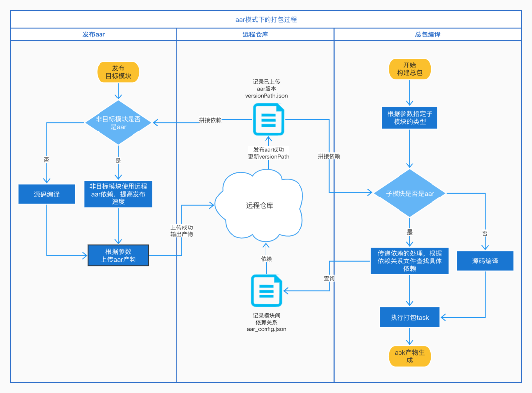 提交并同时构建所有的aar;此种方案优点是发布aar迅速,但因aar依赖顺序问题会出现打包失败,此时只能再打一次包解决此问题; 提交并按依赖顺序构建aar;此种方案能解决打包失败的问题,但总的aar发布时间缓慢,导致整个打包流程的时间剧增,特定情况下会大幅超过源码构建时间。此种情况可对模块进行细粒度的拆分,减少开发业务时频繁的进行aar模块的传递性打包。