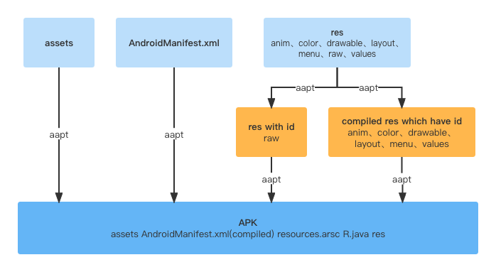 赋予每一个非 assets 资源一个ID值,这些ID值以常量的形式定义在一个 R.java 文件中 生成一个 resources.arsc 文件,用来描述那些具有ID值的资源的配置信息,它的内容就相当于是一个资源索引表