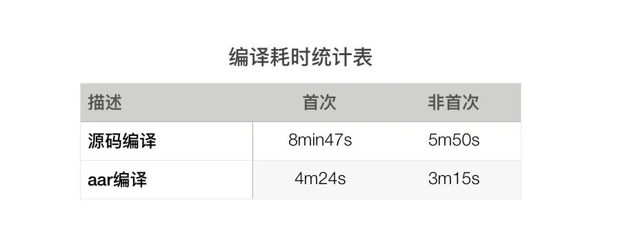 本地电脑测试去除干扰项后,第一次构建源码平均耗时为 8m47s,aar平均耗时为 4m24s, 总包时间缩减率为 50%;第二次构建源码平均耗时为 5m50s,aar平均耗时为 3m15s,总包时间缩减率为 44%。
