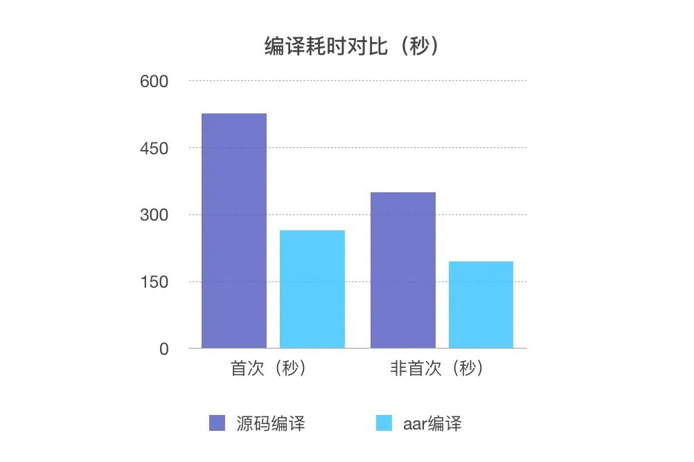 从总包构建时间上来看,通过模块AAR方案改造后 release 总包时间缩减率可达50%左右,时间缩减明显。开发阶段关闭transform等耗时操作且支持部分模块以AAR引入,编译时间会进一步缩减,可有效提高开发效率。 但从整个流程上来看,打包流程从传统的源码构建分成了发布aar和构建aar总包两部分。其中发布aar的平均时间为2m左右,如果发布一个aar后再打总包,此时整个打包流程的时间缩减率在13%~27%之间,而自动化的aar打包会有依赖问题,存在多个aar顺序打包后再打总包的情况,故整个流程上的时间缩减并不明显并大有可能会超过源码编译时间。