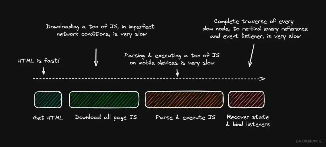 通俗来说 Hydration 就是在客户端重新执行 JS 去修复应用程序内部的 APP_STATE 以及 FRAMEWORK_STATE。在图中的前三个阶段可以被称为 RECOVERY 阶段,这三个阶段主要是在重建你的应用程序。当从 Server 端下发的 HTML 静态页面后,我们希望它是具有交互效果的 HTML 正常应用程序。那么此时 hydartion 的过程必须经历下载 HTML 、下载所有相关 JS 脚本、解析并且执行下载的 JS 脚本。RECOVERY 阶段是和 hydartion 的页面的复杂性成正比,在移动设备上很容易花费 10 秒。由于RECOVERY是昂贵的部分,大多数应用程序的启动性能都不是最佳的,尤其是在移动设备上。前三个阶段被称为 RECOVERY 的阶段其实是完全没有必要的,因为在服务端我们已然渲染过对应的 HTML ,但是为了应用程序的可交互性以及服务端仅保留了静态的 HTML 模版导致不得不在 Client 上继续执行一次 Server 端的逻辑。总而言之,hydration 其实是通过下载并重新执行 SSR/SSG 呈现的 HTML 中的所有 JS 脚本并执行来恢复组建中的事件处理程序。同一个应用程序,会被发送到客户端两次,一次作为 HTML,另一次作为 JavaScript。此外,框架必须立即执行 JavaScript 以恢复在服务器上被丢掉的 APP_STATE和FRAMEWORK_STATE。所有这些工作只是为了检索服务器已经拥有但丢弃的东西!!export const Main = () => <>