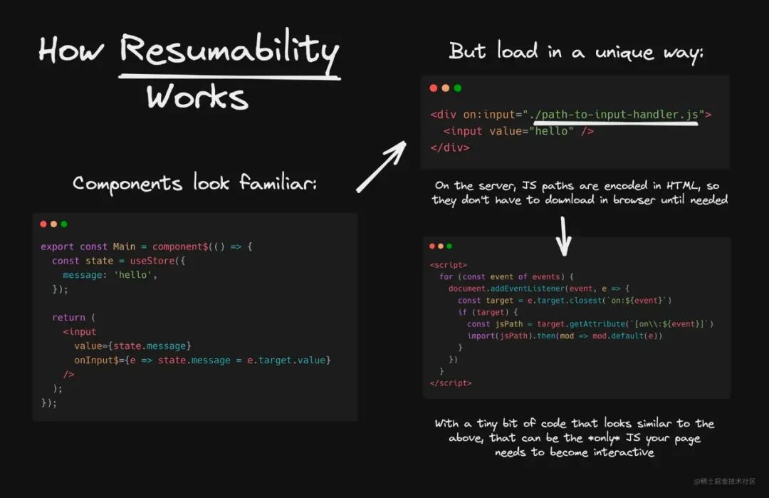 要使网页具有交互性,必须要做的就是通过下载对应 HTML 页面中的 script 脚本并执行代码从而恢复按钮上的交互逻辑和状态。为了具有交互性,客户端不得不执行代码实例化组件后重新创建状态。当上述过程完成后,你的应用程序才会真正具有可交互性。无疑,同一个组件的渲染逻辑被执行了两遍,这是一个非常冗余且耗费性能的过程。2)Resumability: 更加优雅的 hydartion 替代方案所以为了消除额外的开销,我们需要思考如何避免重复的 RECOVERY 阶段。同时还要避免上面的第四步,第四步是执行脚本后给现有的 HTML 附加正确的事件处理程序。qwik 中提出了一个全新的思路来规避 RECOVERY 带来的外开销:- qwik 将需要的状态以及事件序列化保存在 Server 端下发的 HTML 模版中,需要序列化信息需要包括WHAT(事件处理函数内容), WHERE(哪些节点需要哪些类型的事件处理函数), APP_STATE(应用状态), 和FRAMEWORK_STATE(框架状态)。