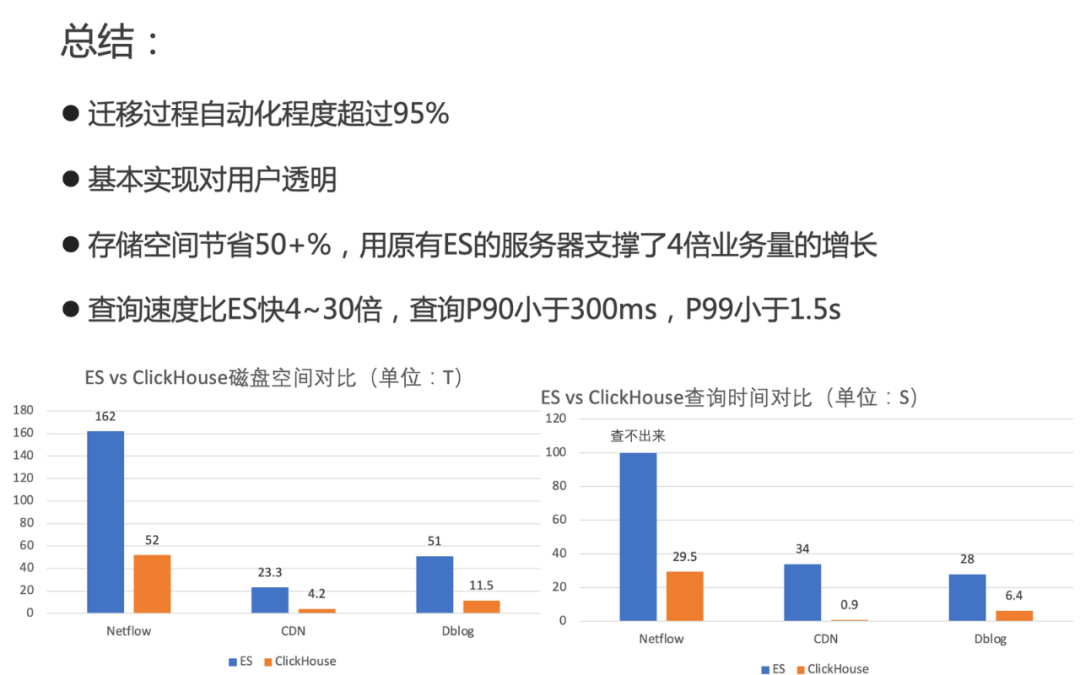 迁移过程自动化程度超过95%,基本实现对用户透明。 存储空间节约50+%(如图17),用原有ElasticSearch的服务器支撑了4倍业务量的增长。 查询速度比ElasticSearch快4~30倍,查询P90小于300ms,P99小于1.5s。