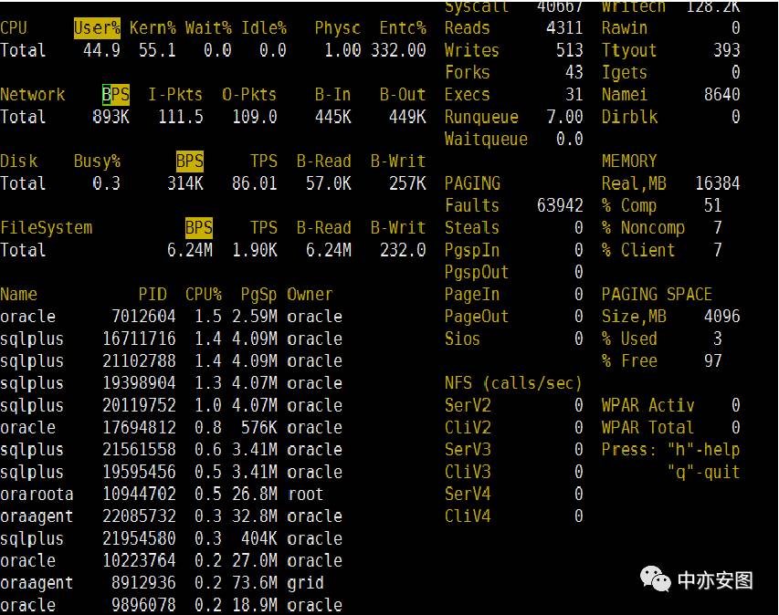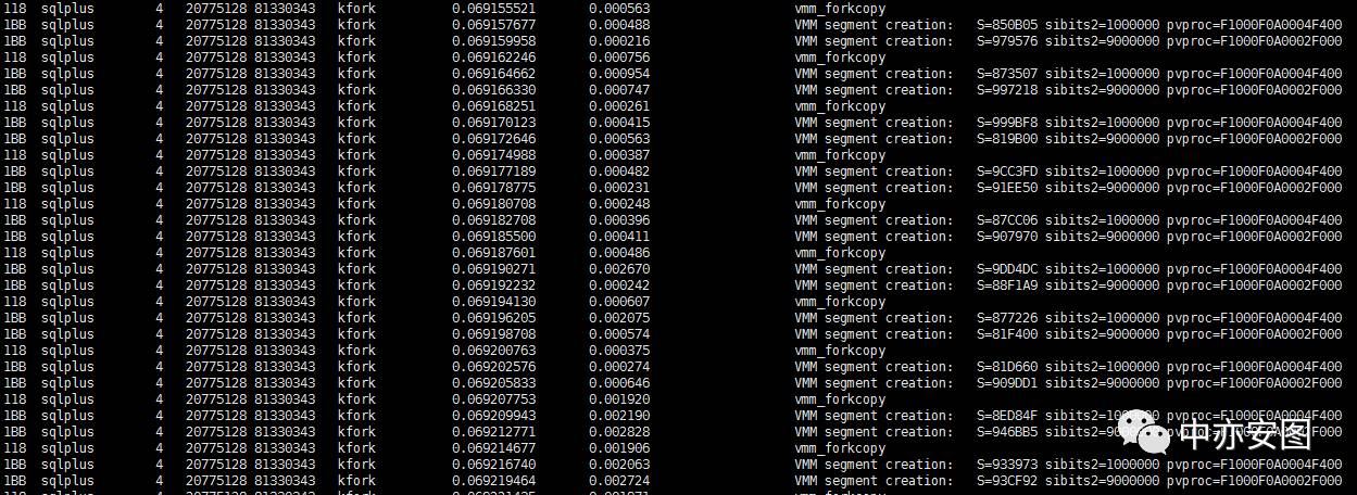 可以看到,kfork调用的具体操作实际大部分都是VMM segment的creation操作和vmm_forkcopy等;VMM也就是AIX的内存管理器,VMM segment creation也就是内存段的创建了,forkcopy看起来不是特别清晰,但也能知道与内存有关;同样再过滤_exit,可以看到主要调用的是VMM page delete;这样问题看起来就清晰了,sqlplus在启动和退出时,分配内存段和销毁内存段占用了大量的CPU时间,当然这种情况我们可以认为是系统CPU高的原因,也可以怀疑系统CPU使用率高后内存分配与销毁出现了缓慢,总之,sqlplus在启动和退出时对内存段的操作值得细究。