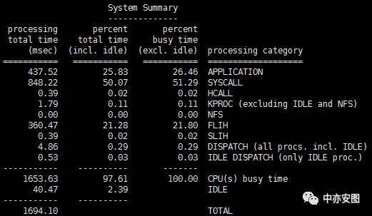 这里,我们可以得知,除了APPLICATION(应用层,比如上层的ORACLE进程的相关操作等)外,占用CPU最多的就是SYSCALL(事实上,SYSCALL本身的CPU时间占比就超过了50%,比APPLICATION要多,这也就是为什么我们最初在操作系统层看到kernel CPU高的原因了);