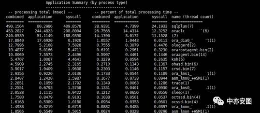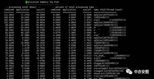 可以看到,TOP进程中主要占据CPU的进程有两类,一类是sqlplus进程,另一类则是oracle的服务器进程,而且非常突出地,sqlplus进程的SYSCALL时间普遍高于APPLICATION的时间,这一点不得不让人疑惑;接下来我们先继续往下看: