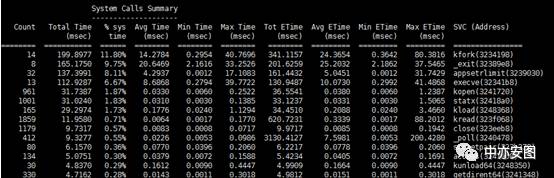 再以进程类型进行统计,确实可以看到,sqlplus进程的SYSCALL时间着实太多,看起来已经差不多了,我们前面可以知道应用代码中就是在数据库服务器本地高并发的调用sqlplus来连接到数据库查询数据生成报表,sqlplus也许就是那个导致CPU使用率高的罪魁祸首;不过,这里我们的操作系统分析还不能到此为止,还有更多内容可以帮我们更精确地定位问题;前面我们都看到SYSCALL占用特别高,这里生成的报告中也有SYSCALL的相关分析:
