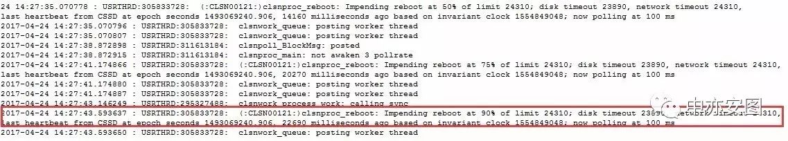没有被从集群中驱逐出来,从集群的角度来讲,cssdagent 和 cssdmonitor 就可能是导致节点重启的杀手了;我们不妨来看看作为cssd的守护进程cssdagent和cssdmonitor的日志: