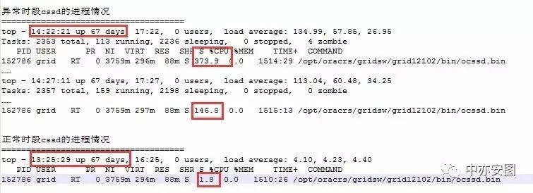 可以看到,在宕机之前的一小段时间,cssd进程的CPU利用率超过了100%,而系统正常时,CPU利用率只有1.8%左右,期间差别有点大;难道,真的是ocssd进程CPU使用率逐步上升,最后一整颗CPU都无法满足其正常运行,然后导致无法及时发送消息给monitor和agent?难道,真的又是一个bug?
