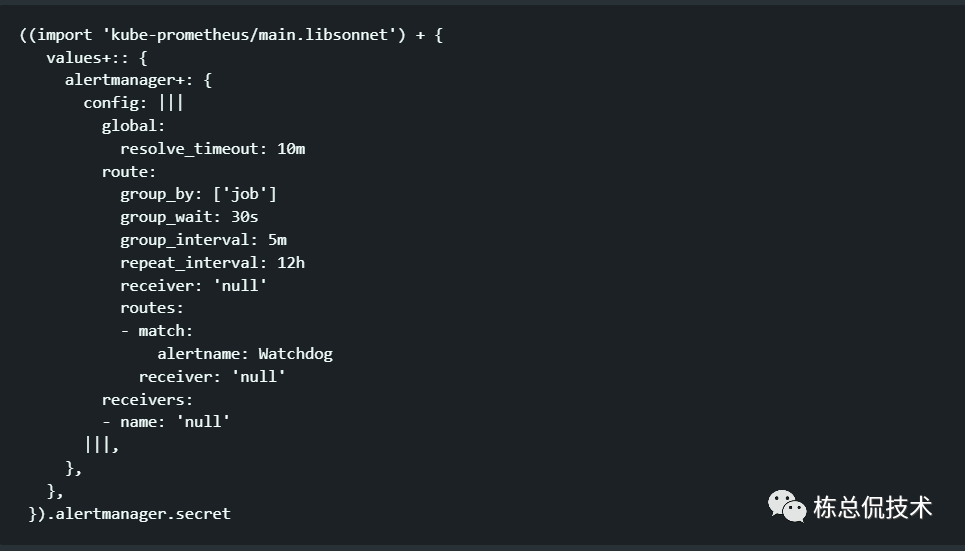 首先查看 alertmanager配置定义的文件,可以看到定义了默认的alertmanger配置,可以通过修改这个文件后重新运行build.sh来重新编译生成manifests下对应的alertmanager-secret.yaml文件。