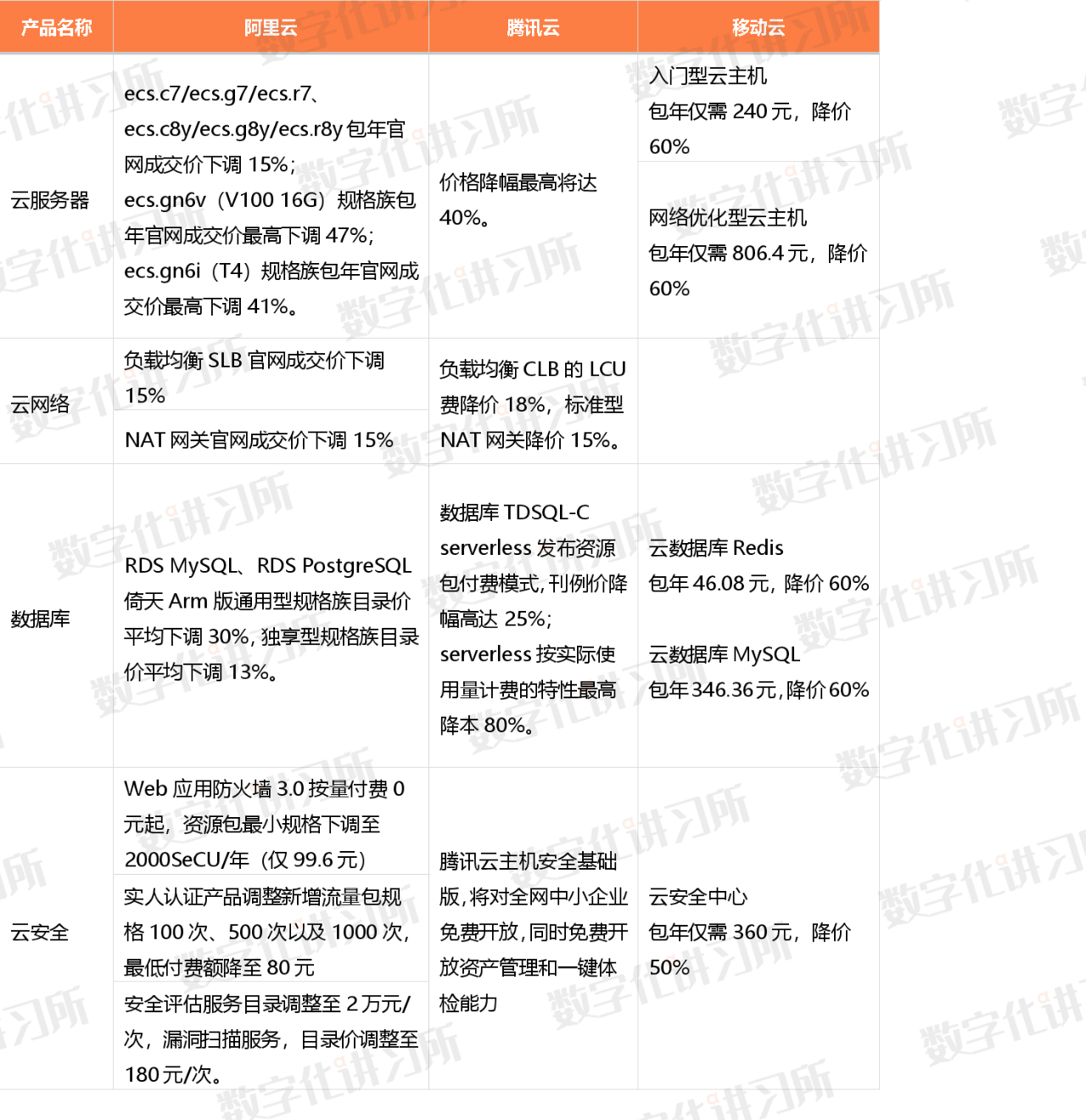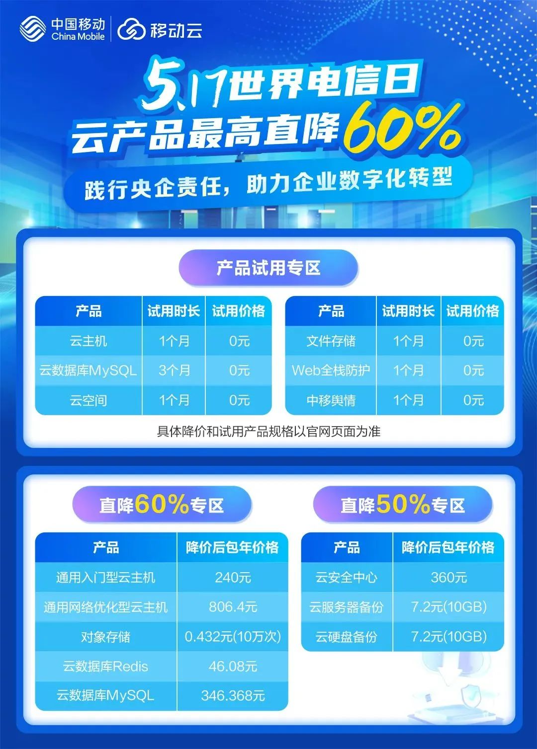 同日,移动云也发布公告,宣布对多款云产品降价,部分产品线最高降幅达60%,据官网知,通用入门型云主机、通用网络优化型云主机,价格降幅均为60%;云安全中心降价50%;云硬盘备份降价50%,活动日期为5月17日至5月31日。