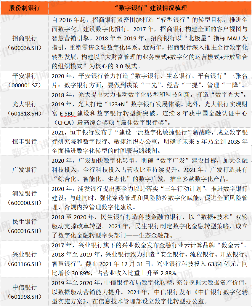 作为市场化程度最高的银行群体,多家股份制银行在保持万亿规模的情况下,积极建设“数字银行”。其中,招商银行(600036.SH)、平安银行(000001.SZ)、光大银行(601818.SH)、恒丰银行、广发银行、浦发银行(600000.SH)、民生银行(600016.SH)、兴业银行(601166.SH)、中信银行(601998.SH)发挥科技驱动作用,推动业务创新,提升场景服务能力,推广数字化经营模式。表1:股份制银行“数字银行”建设情况梳理(不完全统计)