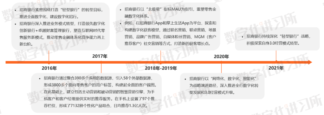 根据中信银行年报,2019年至2020年中信银行布局数字化转型,制定转型规划,加快推进营销数字化,充分挖掘大数据资产价值,以数据驱动营销能力提升。根据中信银行2021年年报,中信银行以金融科技为永续动能,全面塑造全行经营管理的数字化能力,打造智慧、生态、有温度的数字中信,提升全行竞争力和市场价值,全力支撑强核行动高质量落地。2021年,中信银行正式出台《中信银行2021—2023年发展规划》和“342强核行动方案”,明确将金融科技作为全行创新发展的重要突破口,推动数字化转型;发布《中信银行数字化转型实施方案》,在信息技术管理部设立数字化转型办公室。