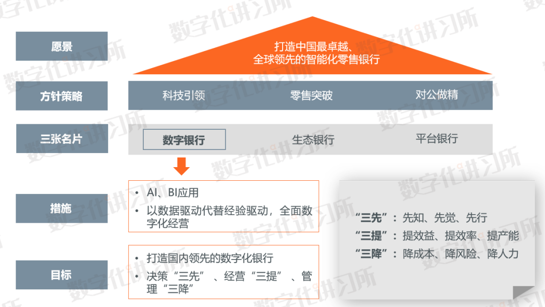 自2020年始,平安银行以“中国最卓越、全球领先的智能化零售银行”为战略目标,坚持“科技引领、零售突破、对公做精”十二字策略方针,全面升级新三年战略举措,着力打造“数字银行、生态银行、平台银行”三张名片。在数字银行方面,要做到决策“三先”(先知、先觉、先行)、经营“三提”(提效益、提效率、提产能)、管理“三降”(降成本、降风险、降人力)。与此同时,平安银行计划全面提升支持消费、服务中小微企业的能力,持续大力支持乡村振兴,积极践行绿色金融,持续加大对民营、小微企业和制造、科技企业的支持力度,为国家“十四五”规划的实施贡献金融力量。图2:平安银行新三年战略规划(2020-2022)- 科技引领(不完全统计)