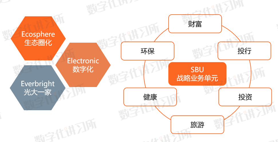 近两年,在数字金融业务方面,光大持续推进数字光大战略,加快数字银行建设,推动交易线上化、移动化,连续8年获中国金融认证中心(CFCA)最高综合奖项“最佳数字银行奖”。在信息科技方面,光大打造“一个大脑、两大平台、三项能力、N个数字化名品”的数字银行发展体系,坚持“123+N”数字银行体系建设,推进业务、营销、服务的线上化、移动化、开放化。光大银行在2018年年报首次提出大力推动数字化转型和科技创新,打造“数字光大”,互联网金融业务快速发展。根据2019年年报,光大打造“一个智慧大脑、两大技术平台、三项服务能力、N个数字化名品”的“123+N”数字银行发展体系,在银行业务转型与创新发展过程中的驱动作用逐渐显现。此外,光大银行实现财富E-SBU建设和数字银行转型新突破,提出了打造六大E-SBU生态圈的全新战略协同发展理念。“SBU”即Strategic Business Unit,战略业务单元。“E”有三个概念,一是Ecosphere,生态圈化;二是Electronic,数字化;三是Everbright,光大一家。六大战略业务单元分别是财富、投行、投资、旅游、健康、环保。
