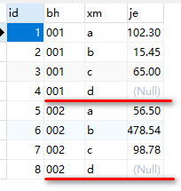 UPDATE `tab` AS t,(SELECTbh,sum( je ) AS totalFROM`tab`WHERExm IN ( 'a', 'b', 'c' )GROUP BYbh) AS nSET t.je = n.totalWHEREt.xm = 'd'AND t.bh = n.bh