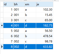 需求:根据bh分类,更新分类后的xm为d的数据,是同类bh的xm是a,b,c的数据之和。