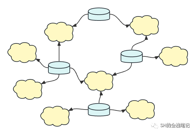 一个简单的网络会由多个节点(AKA 计算机)和连接他们的链路组成。就好像你家里有 3 台电脑,然后它们都相互连接,这样你家里的 3 台电脑就组成了一个简单的网络。而所谓的互联网,就是网络的网络,如下所示: